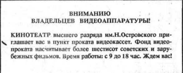 Прокат видеокассет (газета «Шахтёрская правда» за 31 июля 1992 г.)