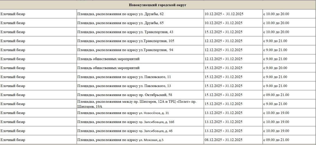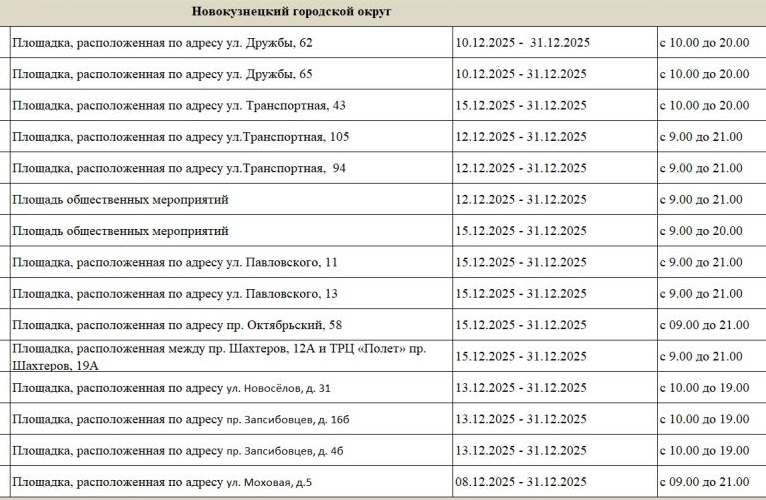 С 13 декабря заработают площадки в Новоильинском районе по адресам: ул. Новосёлов, д. 31, пр. Запсибовцев, д. 16б и пр. Запсибовцев, д. 4б. Торговля будет осуществляться с 10:00 до 19:00.