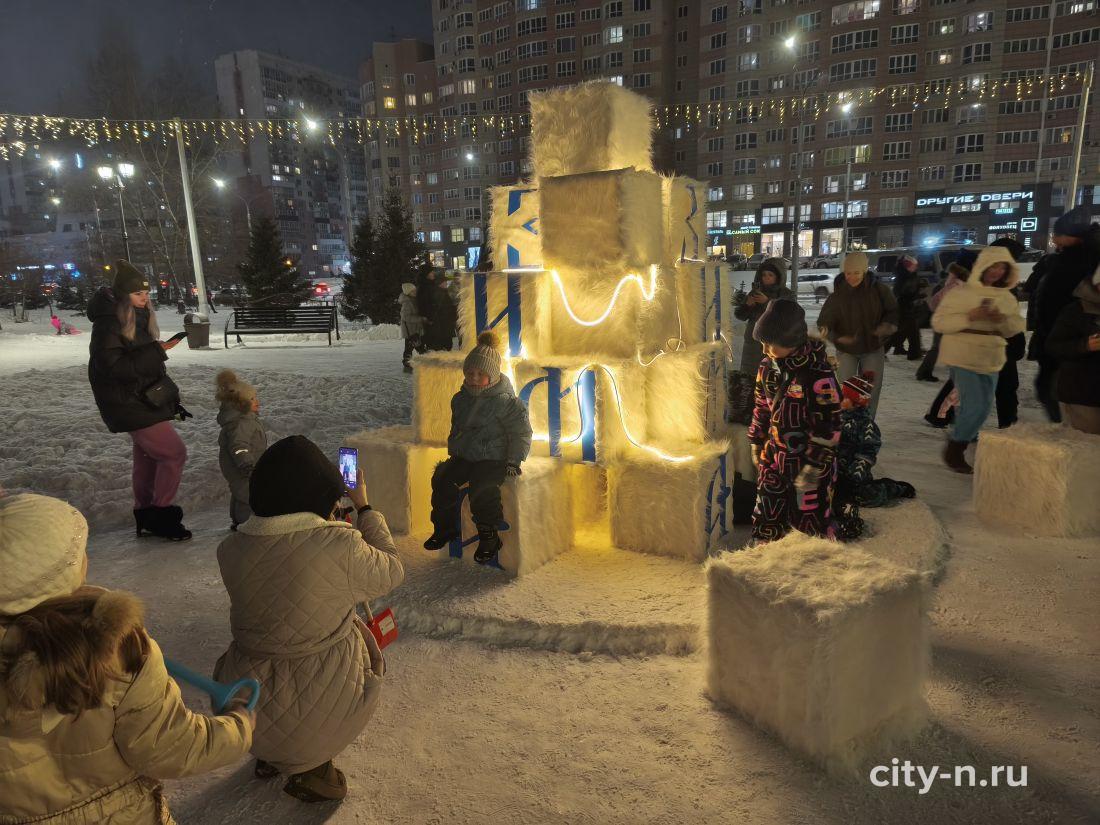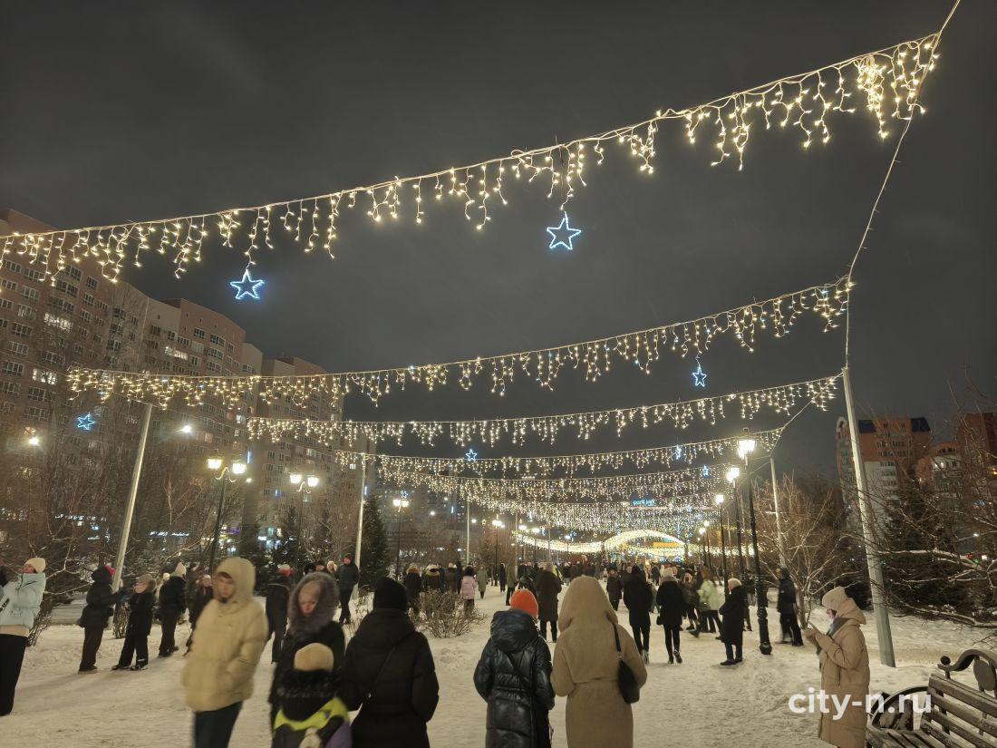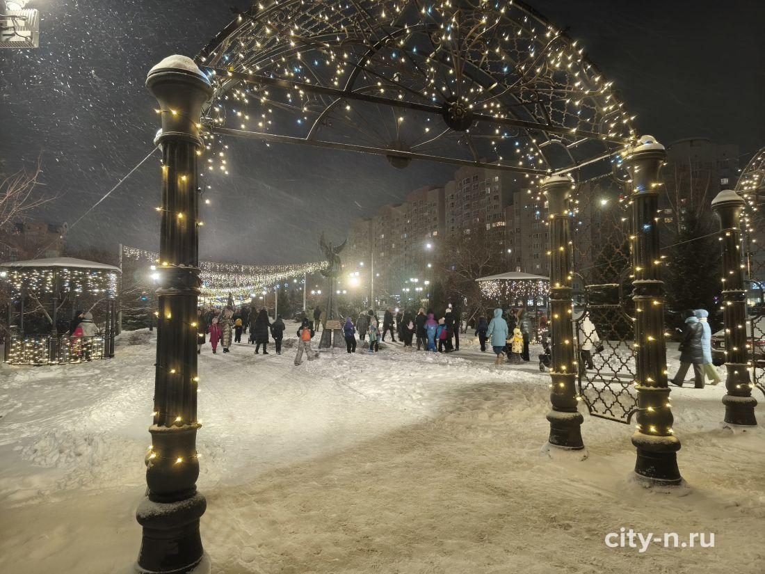 Новогодний арт-объект — подарок предпринимателей города. Здесь смонтировали светящийся навес, подсветили беседки, на месте фонтана смонтирован павильон для красивых фото на память.