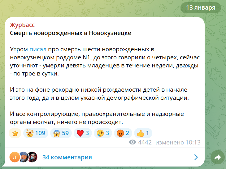 «Утром писал про смерть шести новорождённых в новокузнецком роддоме №1, до этого говорили о четырёх, сейчас уточняют — умерли девять младенцев в течение недели, дважды — по трое в сутки.