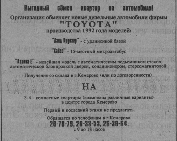 В 90-е годы мошенникам приходилось работать «вживую»: «Женщина представилась работником отдела социальной защиты и предложила помочь с приобретением холодильника. Взяла у него [пенсионера] семь тысяч рублей — и была такова. Случай этот уже не единственный».