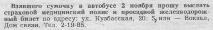 Просьба взявшему сумочку (газета «Вариант» за 12 ноября 1992 г.)