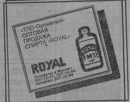 Продажа спирта «Рояль» (газета «Кузбасс» за 24 ноября 1992 г.)