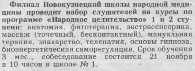 Школа народной медицины (газета «Вариант» за 12 ноября 1992 г.)