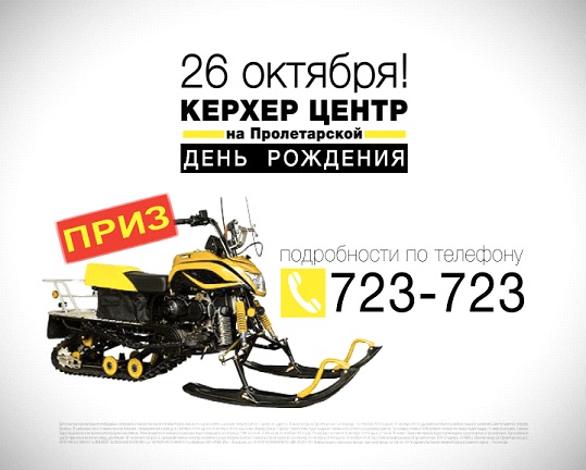 И самый главный ритуал: сделайте любую покупку в КЕРХЕР ЦЕНТРЕ на ПРОЛЕТАРСКОЙ хоть на 5 рублей и двадцать шестого октября Вам обязательно повезёт в розыгрыше снегохода и других призов от НАС.
