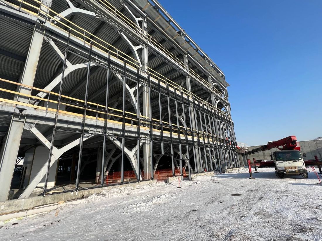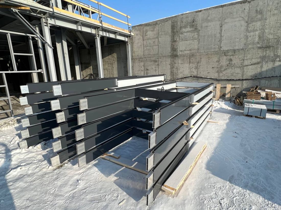 80 тонн алюминиевых конструкций стоечно-ригельной системы фасадов предстоит установить строителям до прихода тепла. До конца апреля планируется смонтировать более 5 тыс. м² витражей. Первые конструкции фасадов начали устанавливать 9 февраля, и на сегодня ими уже закрыли 3 уровня западной стены.