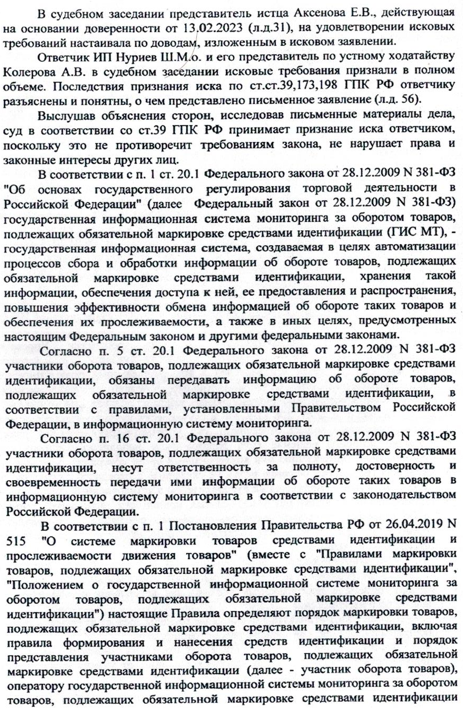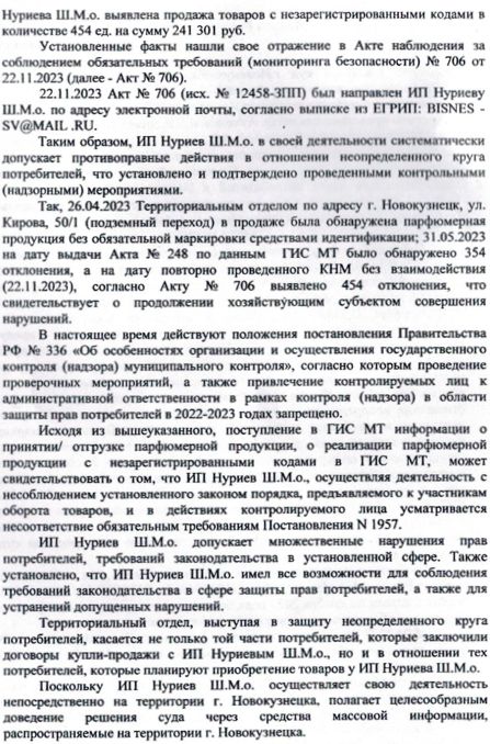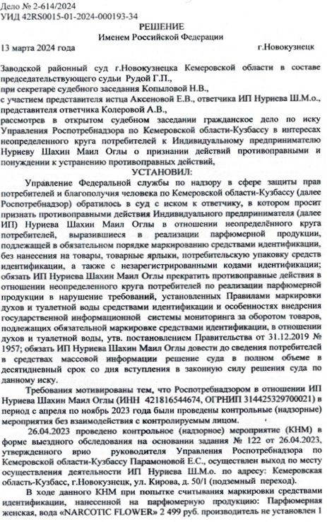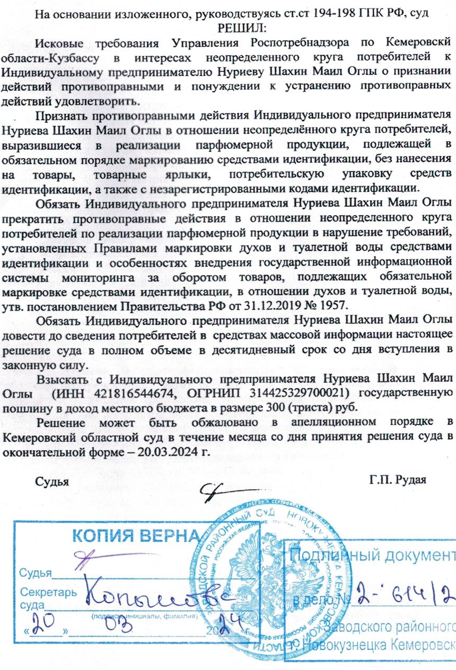 Управление Федеральной службы по надзору в сфере защиты прав потребителей и благополучия человека по Кемеровской области-Кузбассу (далее Роспотребнадзор) обратилось в суд с иском к ответчику, в котором просит признать противоправными действия Индивидуального предпринимателя (далее ИП) Нуриева Шахин Маил Оглы в отношении неопределённого круга потребителей, выразившиеся в реализации парфюмерной продукции, подлежащей в обязательном порядке маркированию средствами идентификации, без нанесения на товары, товарные ярлыки, потребительскую упаковку средств идентификации, а также с незарегистрированными кодами идентификации; обязать ИП Нуриева Шахин Маил Оглы прекратить противоправные действия в отношении неопределённого круга потребителей по реализации парфюмерной продукции в нарушение требований, установленных Правилами маркировки духов и туалетной воды средствами идентификации и особенностях внедрения государственной информационной системы мониторинга за оборотом товаров, подлежащих обязательной маркировке средствами идентификации, в отношении духов и туалетной воды, утв. Постановлением Правительства от 31.12.2019 №1957; обязать ИП Нуриева Шахин Маил Оглы довести до сведения потребителей в средствах массовой информации решение суда в полном объёме в десятидневный срок со дня вступления в законную силу решения суда по данному иску.