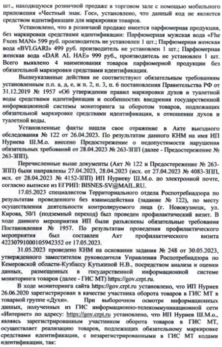 В ходе мониторинга сайта http://gov.crpt.ru установлено, чтоИП Нуриев 26.06.2020 зарегистрирован в качестве участника оборота товаров в ГИС МТ в товарной группе «Духи». При выборочном осмотре информационных данных, полученных от ГИС информационно-телекоммуникационной сети «Интернет» по адресу: http://gov.crpt.ru установлено, что ИП Нуриев Ш.М.о, являясь зарегистрированным участником оборота товаров в ГИС МТ, осуществляет реализацию товаров, подлежащих обязательной маркировке средствами идентификации, с незарегистрированными в ГИС МТ кодами идентификации, так: