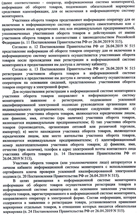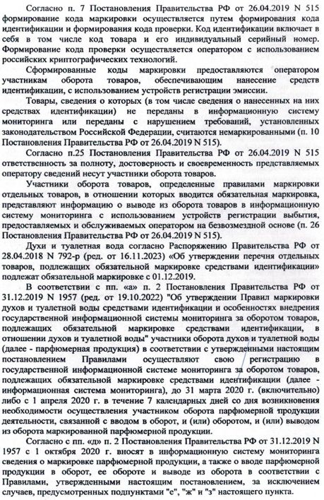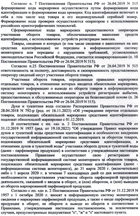 Вышеуказанные действия не соответствуют обязательным требованиям, установленным п.п. а, д, е, ж п. 2, п. 3, п. 6 постановления Правительства РФ от 31.12.2019 №1957 «Об утверждении правил маркировки духов и туалетной воды средствами идентификации и особенностях внедрения государственной информационной системы мониторинга за оборотом товаров, подлежащих обязательной маркировке средствами идентификации, в отношении духов и туалетной воды.