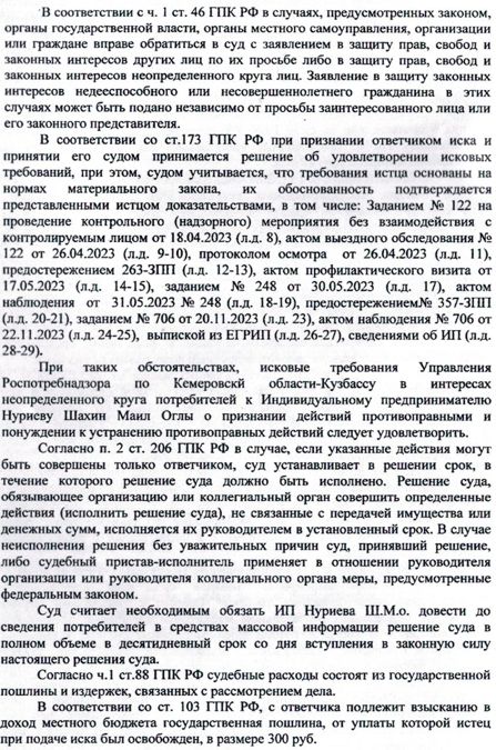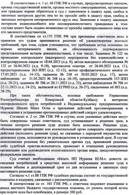 Требования мотивированы тем, что Роспотребнадзором в отношении ИП ИП Нуриева Шахин Маил Оглы (ИНН 421816544674, ОГРНИП 314425329700021) в период с апреля по ноябрь 2023 года были проведены контрольные (надзорные) мероприятия без взаимодействия с контролируемым лицом.