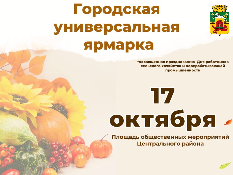 17 октября с 9:00 до 15:00 на Площади общественных мероприятий Центрального района пройдёт универсальная ярмарка, посвященная празднованию Дня работников сельского хозяйства и перерабатывающей промышленности.