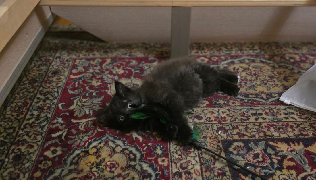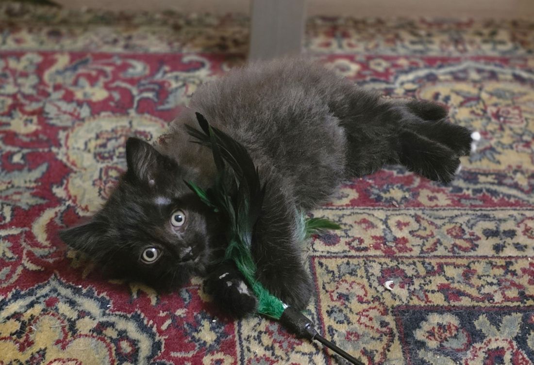 Автор рассказывает, что за несколько дней малыш освоился в квартире: в туалет ходит на лоток с наполнителем, ест практически всё, что ему предлагают, а также очень ласков и игрив: если его погладить, то тут же прижимается и начинает мурчать.
