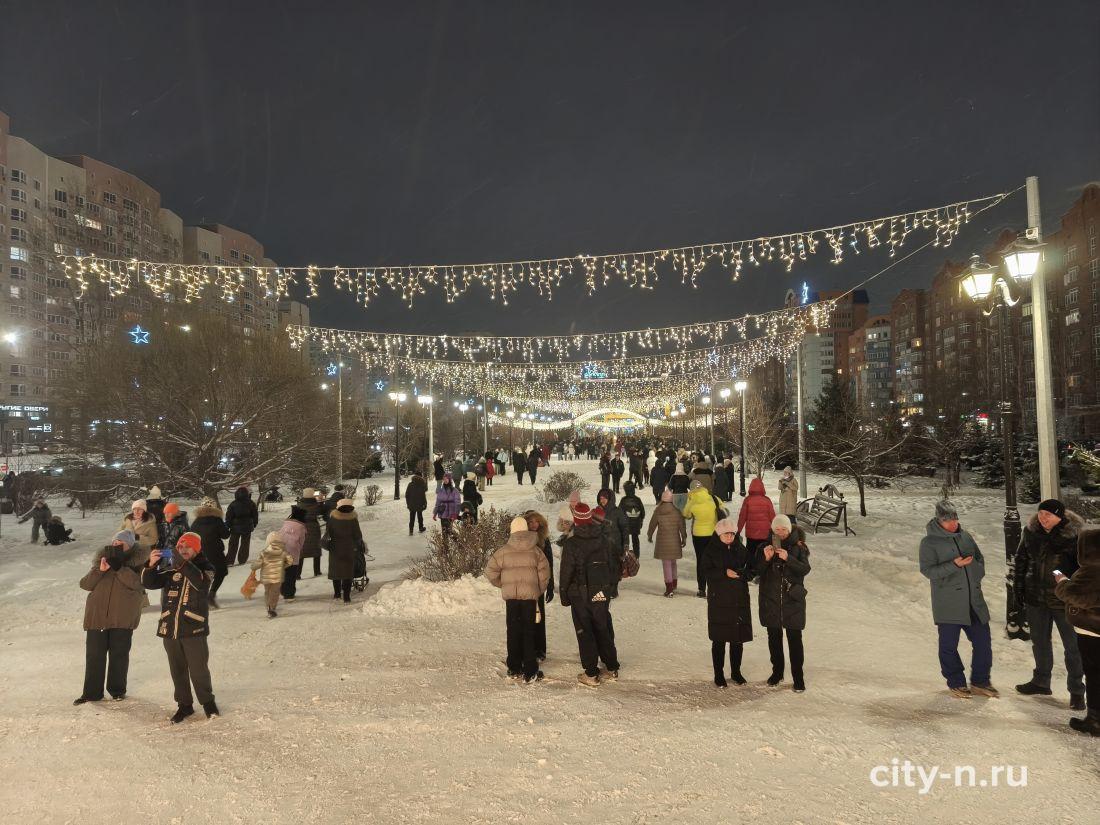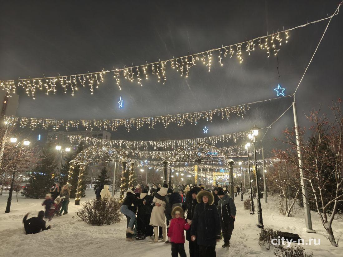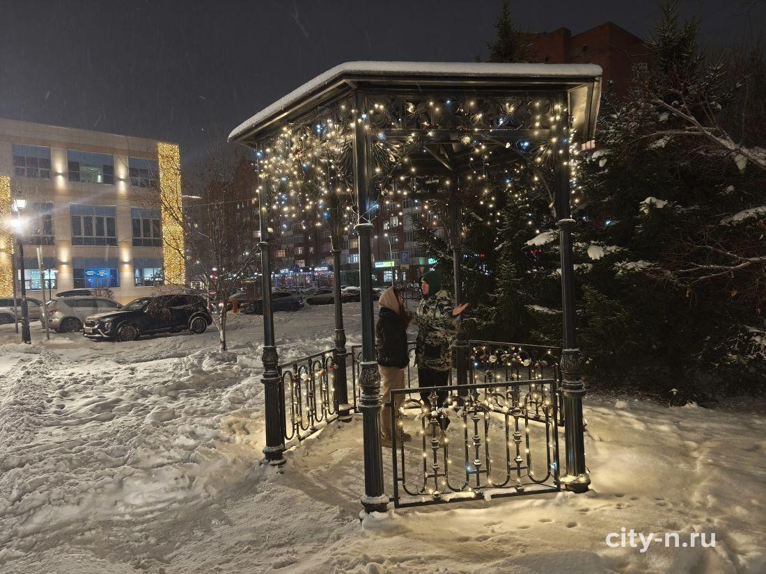 Новогодний арт-объект — подарок предпринимателей города. Здесь смонтировали светящийся навес, подсветили беседки, на месте фонтана смонтирован павильон для красивых фото на память.